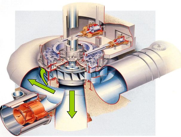 With about 60% of the global hydropower capacity in the world, Francis turbines are the most widely used type of hydro turbine. They operate in a water head from 40 to 600 m (130 to 2,000 ft) and are primarily used for electrical power production. The electric generators that most often use this type of turbine have a power output that generally ranges from just a few kilowatts up to 800 MW, though mini-hydro installations may be lower. Penstock (input pipes) diameters are between 3 and 33 ft (0.91 and 10 m). The speed range of the turbine is from 75 to 1000 rpm. A wicket gate around the outside of the turbine's rotating runner controls the rate of water flow through the turbine for different power production rates. Francis turbines are almost always mounted with the shaft vertical to isolate water from the generator. This also facilitates installation and maintenance. Care m,ust be taken with designs to eliminate pressure surge which can have a disasterious effect on teh mechanical equipment. These turbines can work in run of river aplications where a rivers natural path is diverted by a weir though to the penstocks and in to the turbine. The water enters the runner via the wicket gate and exits through a draft tube and tailrace. Pumped-storage hydroelectricity (PSH), or pumped hydroelectric energy storage (PHES), is a type of hydroelectric energy storage used by electric power systems for load balancing. The method stores energy in the form of gravitational potential energy of water, pumped from a lower elevation reservoir to a higher elevation. Low-cost surplus off-peak electric power is typically used to run the pumps. During periods of high electrical demand, the stored water is released through turbines to produce electric power. Although the losses of the pumping process makes the plant a net consumer of energy overall, the system increases revenue by selling more electricity during periods of peak demand, when electricity prices are highest