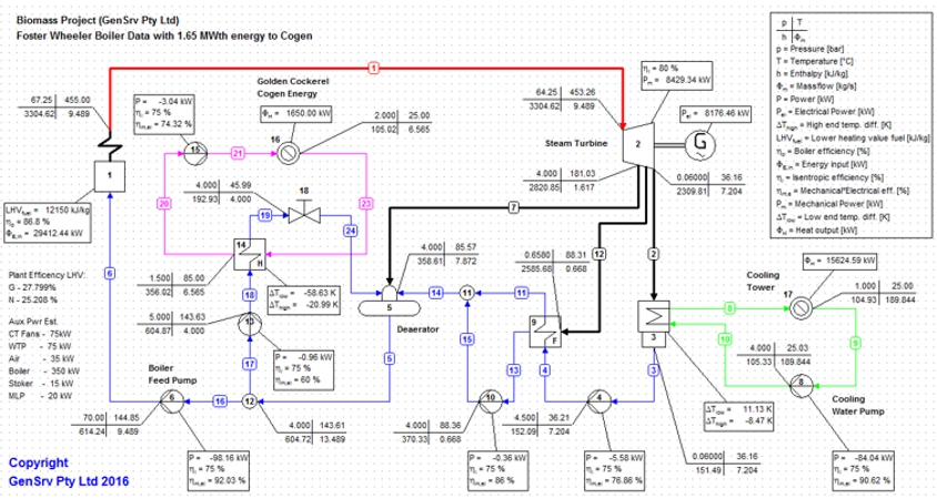 As can be seen in the process model above. We have generated a steam boiler diagram for a small biomass plant. As the client is looking for the highest output and best efficiency we can easily determine the terminal parameters and then calculate the balance. For example, here we know we will achieve about 8MW based on the CV of the fuel and the quantity available. Knowing we are looking at 8MW it is clear there is no need to go to high steam pressure and temperature levels as the cost would out way the small benefit.